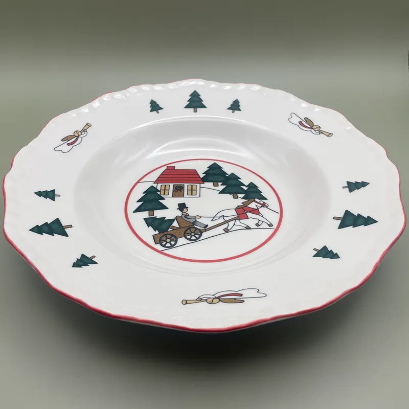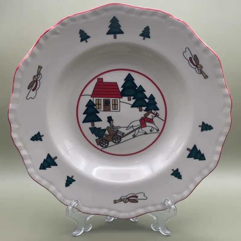 Het bord is uitgevoerd in het iconische rode transferware op een warm, crèmekleurig aardewerk. In het midden schittert een gedetailleerde afbeelding van een besneeuwd Engels dorpje, compleet met kerstbomen en een man met paard en wagen. De rand is rijkelijk versierd met kerstbomen en engelen, wat elk diner direct een feestelijke uitstraling geeft.